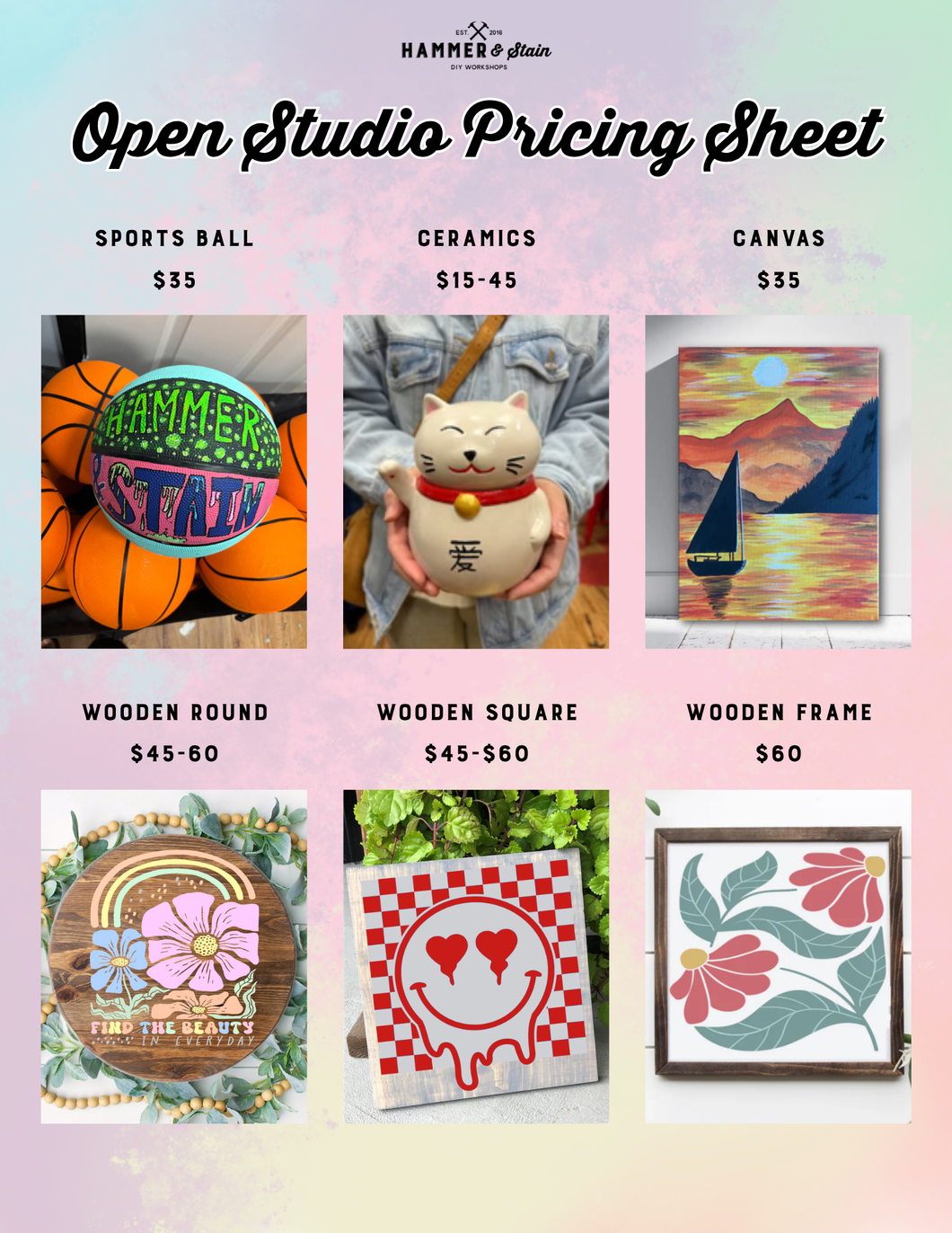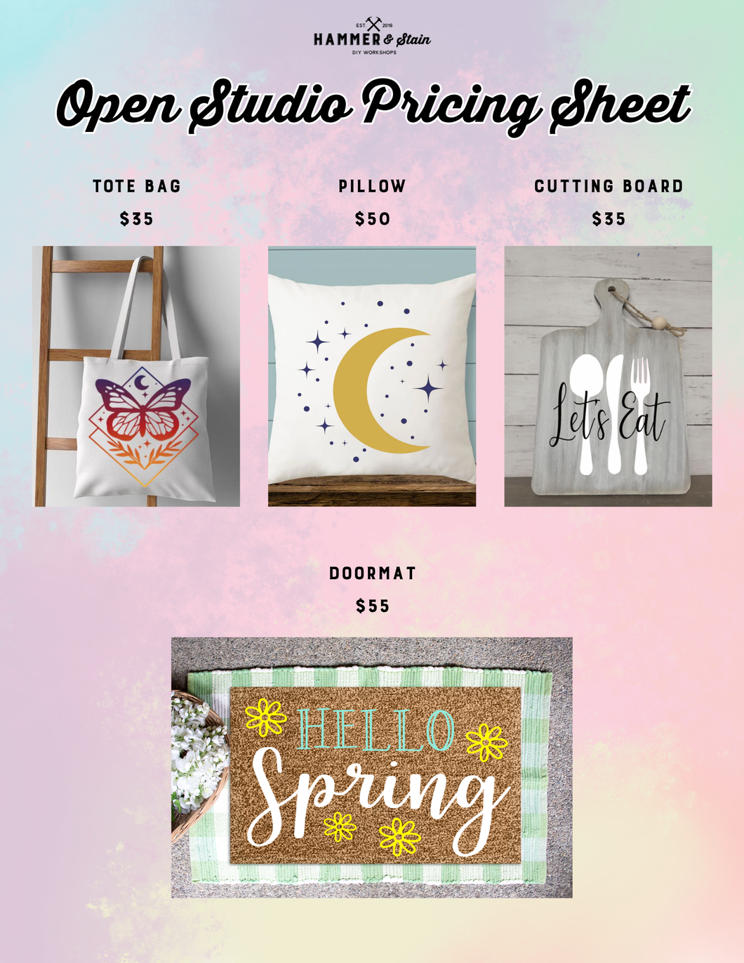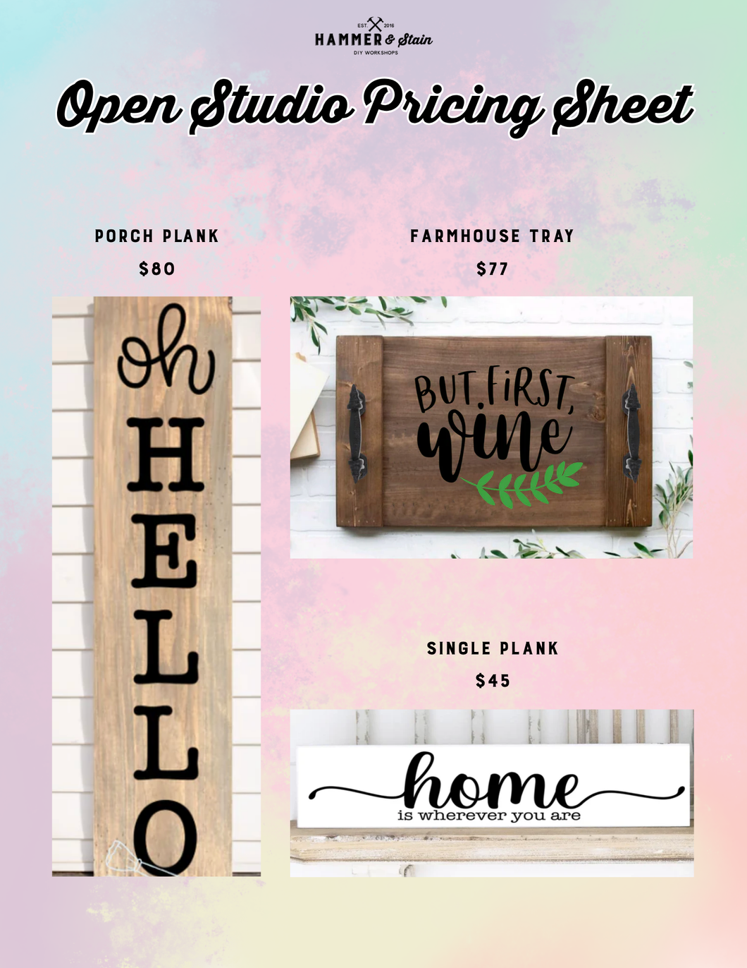 If you have a custom request or would like a specific design, please email us at hammerandstainrockville@gmail.com at least 1 week in advance, and we’ll do our best to prep it for you.