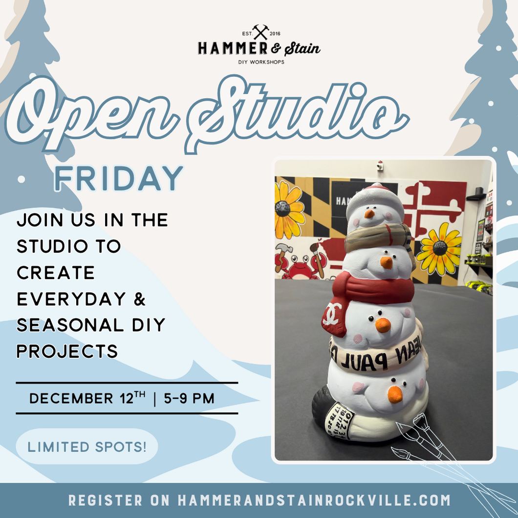 Drop in anytime during Open Studio to craft something amazing! Choose from a wide variety of projects starting at just $15. Whether you're making a handmade gift or a DIY piece for your home, Open Studio is a relaxed and fun way to get creative!